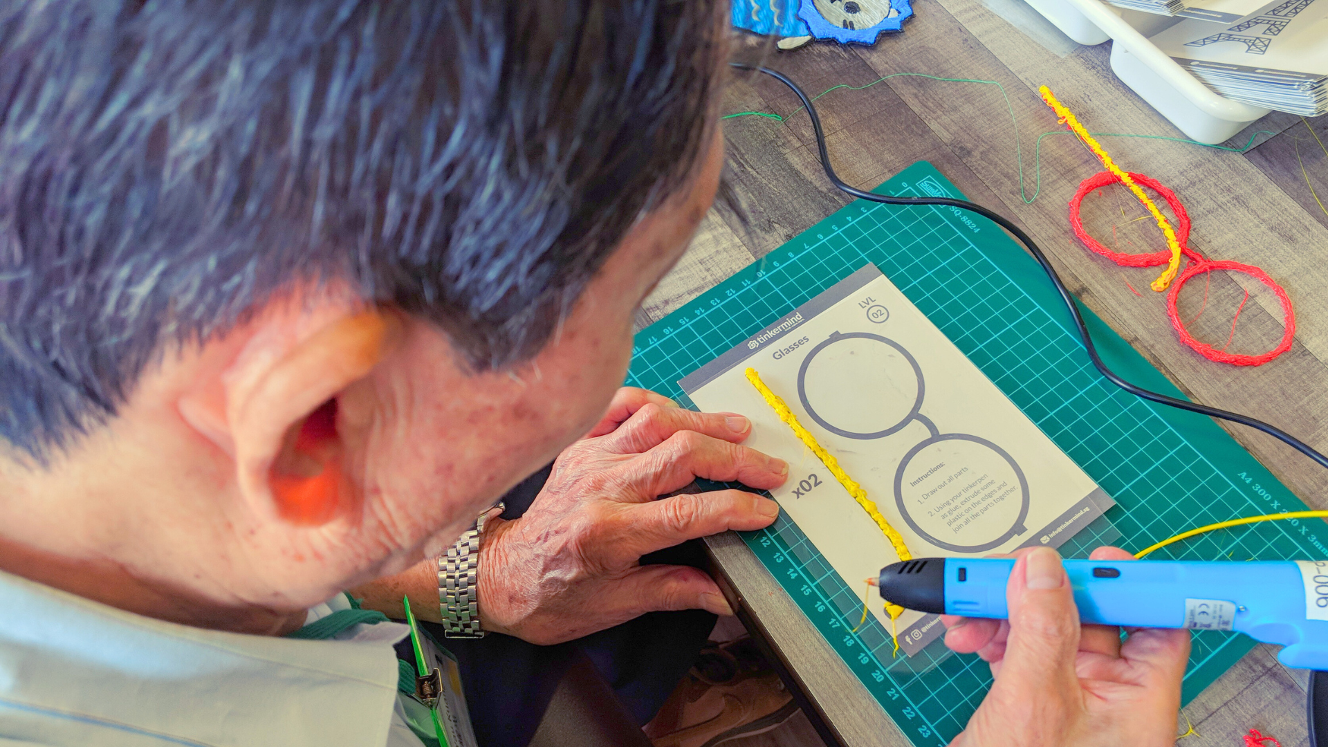 Seniors playing with 3D printing pens to exercise creativity & fine motor skills.